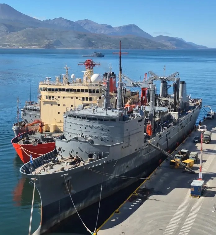 Desde el pasado sábado 7 de marzo, el gigante naranja se encuentra realizando tareas de alistamiento junto al buque logístico ARA Patagonia y el aviso ARA Puerto Argentino. En el sector portuario se observa un movimiento constante de materiales para establecer el puente logístico necesario que abastezca a los medios navales de cara a la última etapa. Las maniobras se centran en el embarque de víveres, combustibles y diversos suministros esenciales para la permanencia de las dotaciones en el sector antártico.