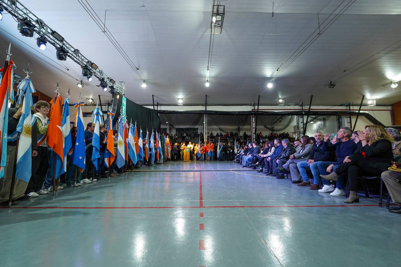 TOLHUIN.- El intendente Daniel Harrington se puso al frente del acto por el 53° aniversario de esta ciudad, trasladado al Polideportivo Ezequiel Rivero por la alerta meteorológica. Ante los vecinos, el Jefe comunal hizo un balance jugoso de la gestión y dejó en claro que Tolhuin sigue con paso firme en su crecimiento, aunque advirtió que necesitan el apoyo de Nación para los proyectos que se vienen.