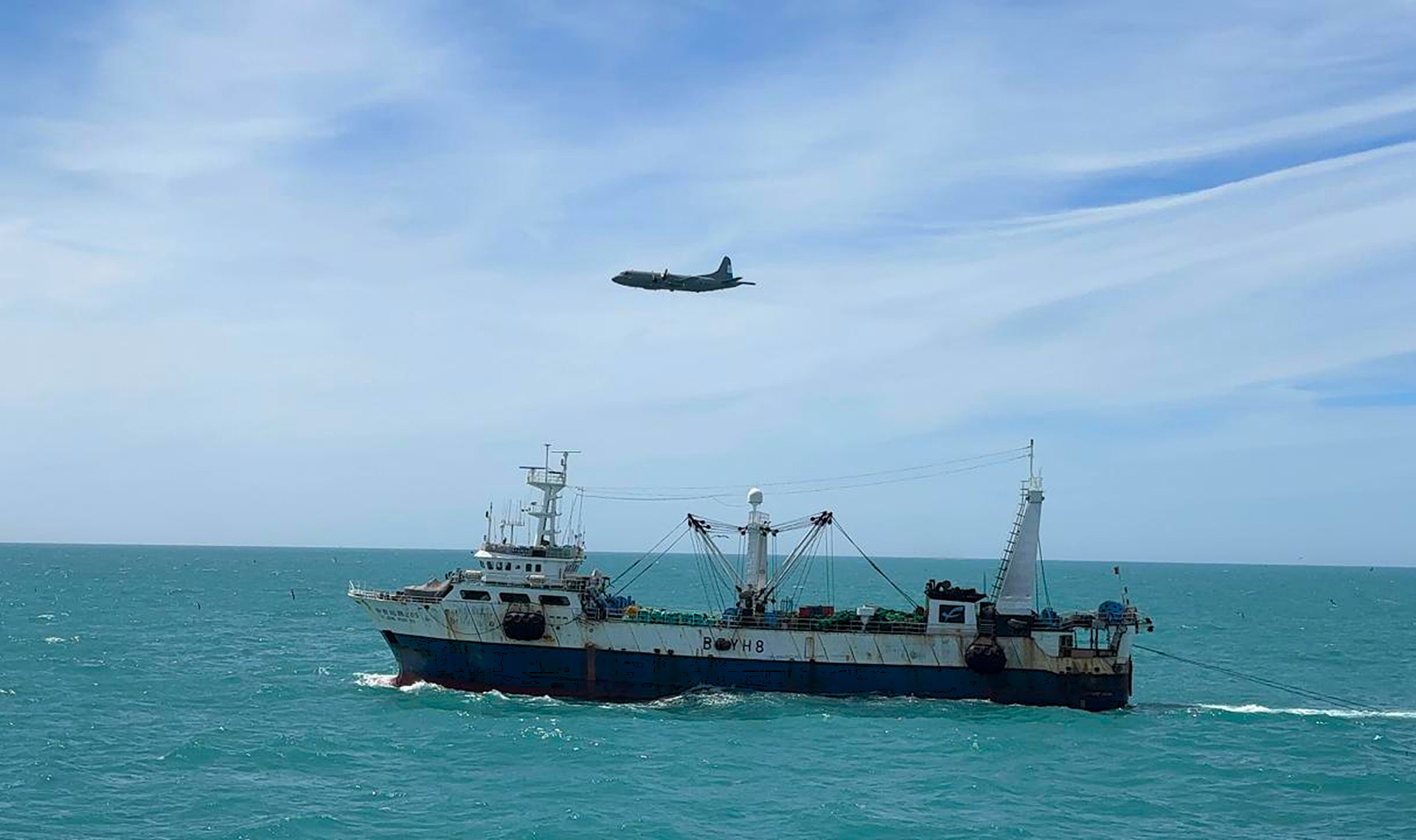 Simultáneamente a la intervención del patrullero, la aeronave P-3 Orion se ocupó de las tareas de supervisión de los espacios marítimos. Su rol fue asegurar el sostén operacional del buque en superficie, sobrevolando el sector para recabar la información y el acervo probatorio necesario para dejar constancia de la falta cometida.