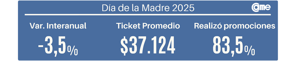 El ticket promedio alcanzó los $ 37.124, lo que representa un incremento nominal del 9,8% frente a los $ 33.819 registrados en 2024. Sin embargo, al ajustar por inflación, la variación real es negativa en 16,7%, lo que indica que las familias destinaron menos dinero que el año pasado para celebrar el Día de la Madre. A pesar de que el 83,5% de los comercios aplicó descuentos, promociones y cuotas sin interés, las ventas no lograron repuntar en términos reales. La amplia adopción de estrategias comerciales –como reintegros bancarios, ofertas cruzadas y financiación extendida– permitió sostener el movimiento en algunos rubros, pero sin traducirse en un aumento del consumo efectivo.
