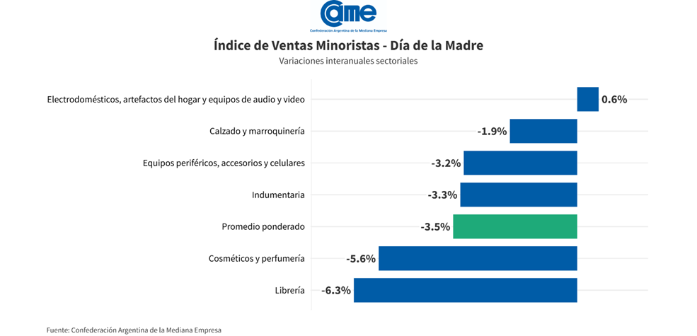 El rubro tecnológico fue el único que logró crecer en términos reales, con un aumento del 15,7%, impulsado por el recambio de dispositivos y las facilidades de financiación. En cambio, cosmética y perfumería mostró la baja más marcada, con una contracción del 24,2% real, mientras que librería retrocedió 1,7%.